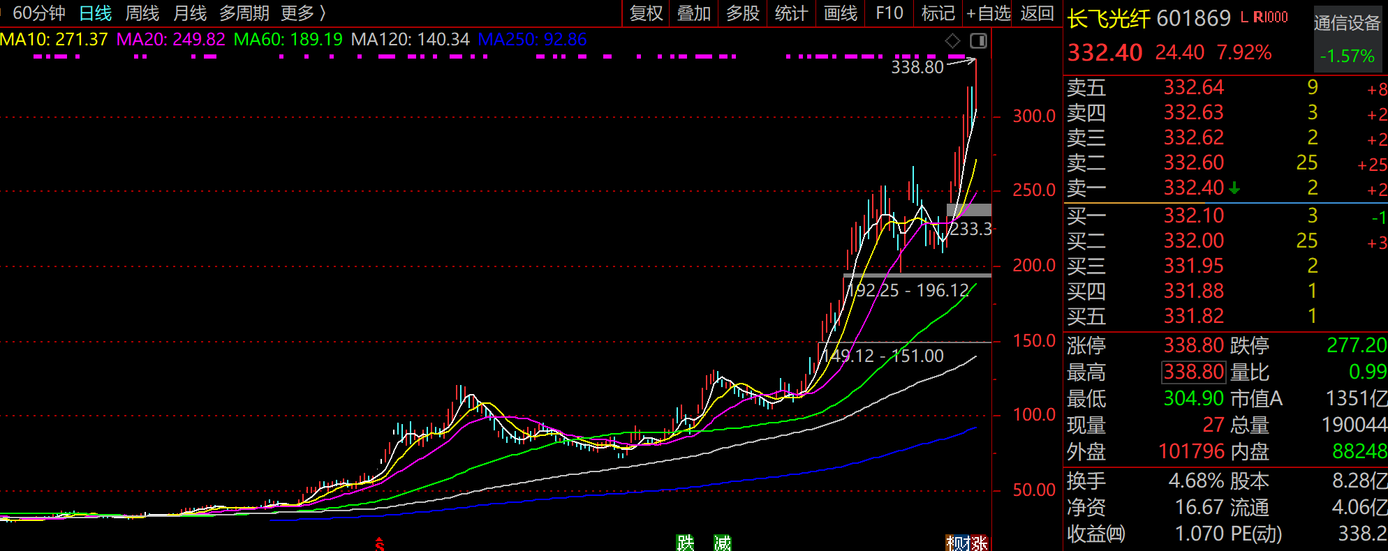 武汉大牛股长飞光纤继续“开挂”之旅,4月2日,A股全线调整,上证指数跌近1%,深证成指午后跌超2%。长飞光纤股价盘中涨停,最高探至338.80元,近8个交易日仅1天下跌,累计涨幅高达56%,市场交投高度活跃。
