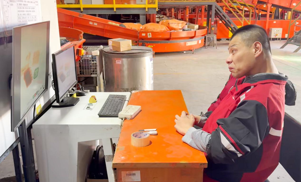 写下这些诗句的人,叫殷明哲。他是圆通北京集运中心的一名安检员,也是一位先天性脑瘫患者。诗歌,是他与生活对话的方式。他的日常,是坐在传送带旁,日复一日地守着安检屏幕。