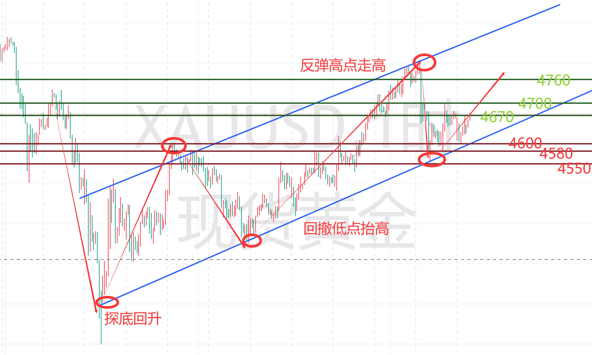 短线4小时级别价格围绕中轨进行震荡修复,KDJ跟RSI拐头向上,价格有反弹需求。早上多次试探4600关口,未能有效跌破,受支撑走反弹,日内操作上低多为主,上方压制关注4670跟4700,其次关注4760一线,日k中轨压制,站稳这里看4800去。下方支撑关注4600跟4580以及4550一线,低多围绕这里进行参与。