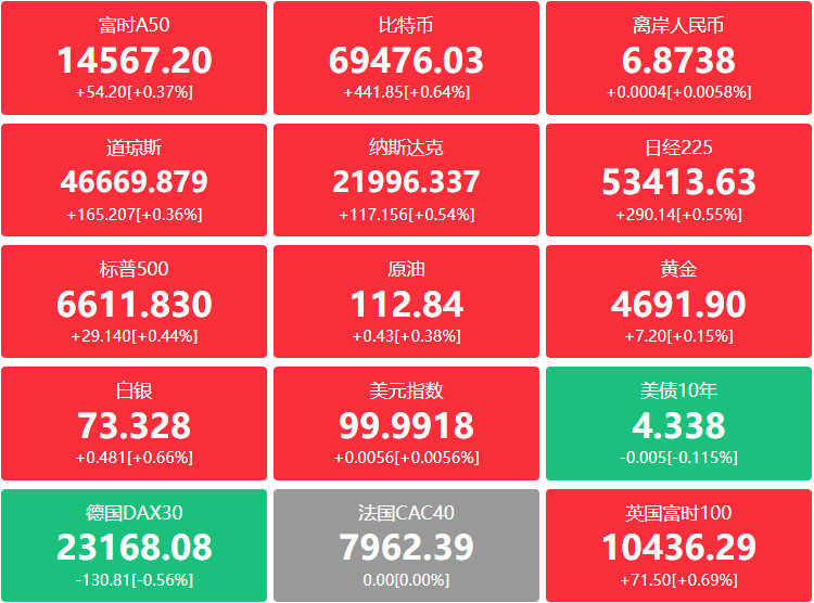 期货:现货黄金跌0.54%报4651.24美元,黄金期货涨0.01%报4680.30美元;现货白银跌0.23%报72.8569美元,白银期货涨0.16%报73.040美元;铜期货涨0.44%报5.6080美元;现货铂金跌0.35%,现货钯金跌1.29%;原油期货涨0.87美元,涨幅0.78%报112.41美元,布伦特原油涨0.74美元,涨幅0.68%报109.77美元;天然气期货报2.8110美元,汽油期货报3.3082美元,取暖油期货报4.3284美元。