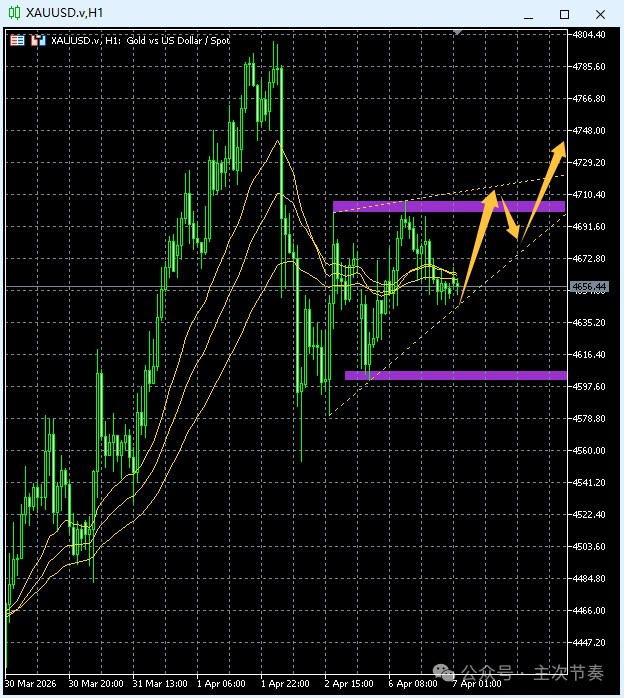 一句话看懂黄金Gold:小时图震荡节奏很规范,短线多空双方均衡,优先尝试上破。