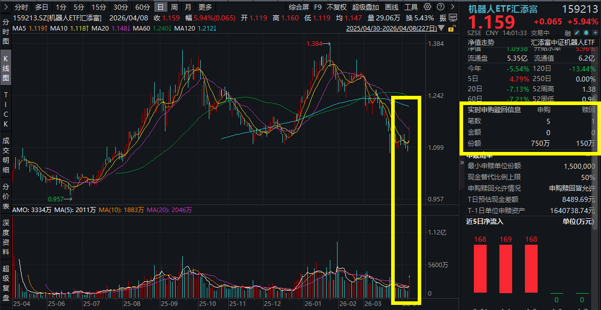4月8日,中东局势缓和背景下,A股市场强劲反攻,机器人板块大涨!截至14:02,机器人ETF汇添富(159213)放量涨近6%,有望终结三连跌!资金抓紧跑步进场,机器人ETF汇添富(159213)强势吸金超660万元!