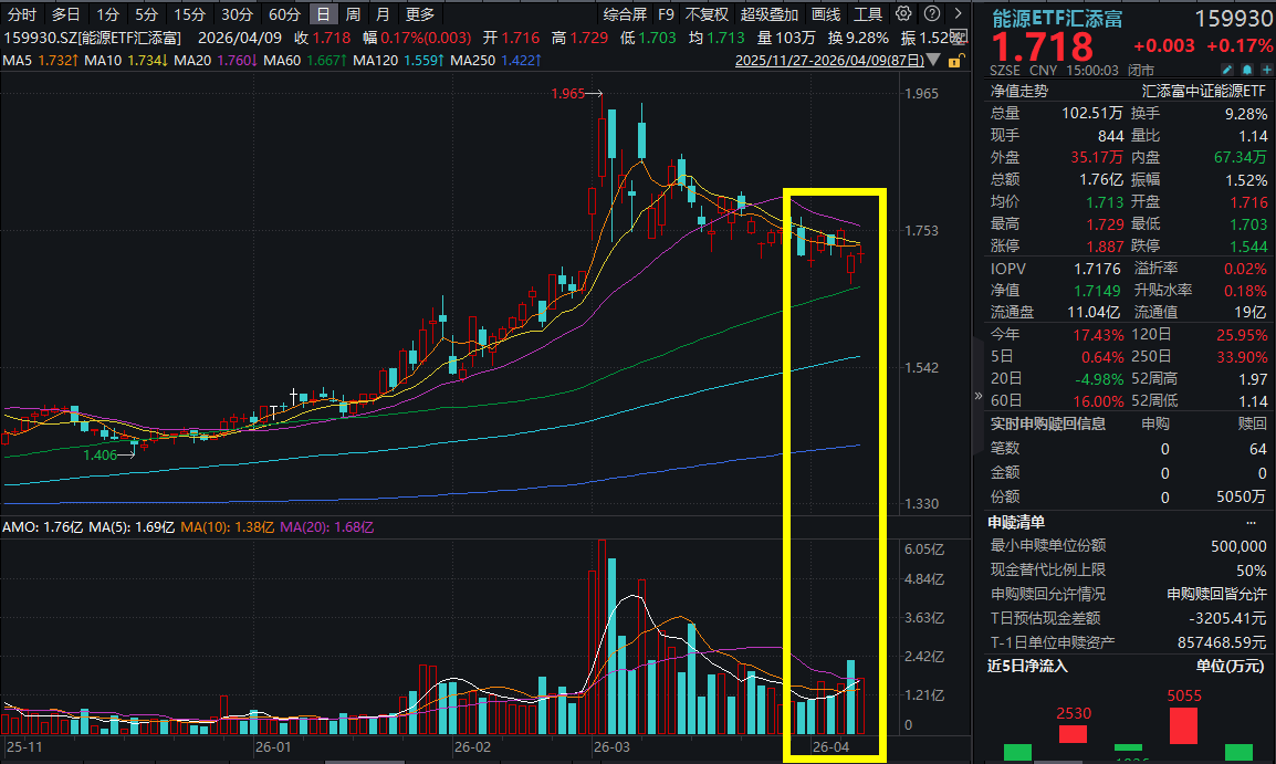 4月9日,受中东局势最新消息影响,A股市场震荡回调,油气、能源板块逆势上涨。截至15:00,仅含24只煤油股的能源ETF汇添富(159930)、纯度更高的油气ETF汇添富(159309)微涨。
