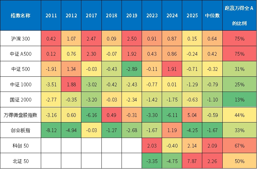图:历年(2010-2025年)4月份主流指数月涨跌幅(%)以及跑赢万得全A的年数比例