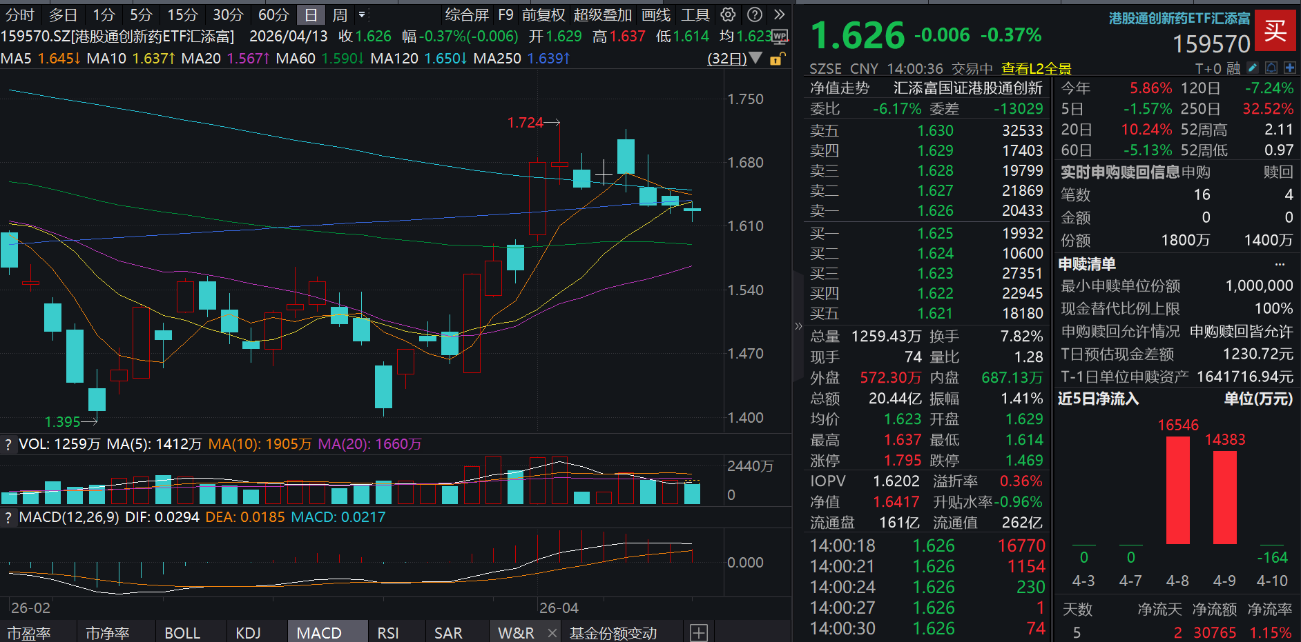 今日(4.13),港股市场全线飘绿,创新药纯度100%的港股通创新药ETF汇添富(159570)小幅回调0.37%,成交额快速突破20.5亿元,盘中再获资金净流入,近5日累计“吸金”超3亿元!截至4月12日,港股通创新药ETF汇添富(159570)最新规模超264亿元,同类领先!