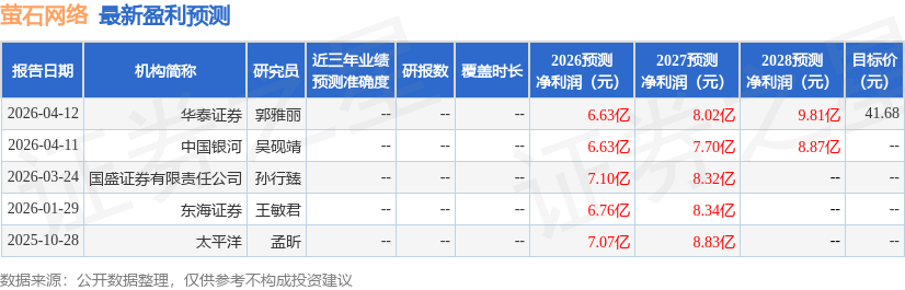 群益证券(香港)有限公司王睿哲近期对萤石网络进行研究并发布了研究报告《2025稳步增长,26Q1净利YOY+32%,好于预期》,下调萤石网络目标价至33.0元,给予增持评级。