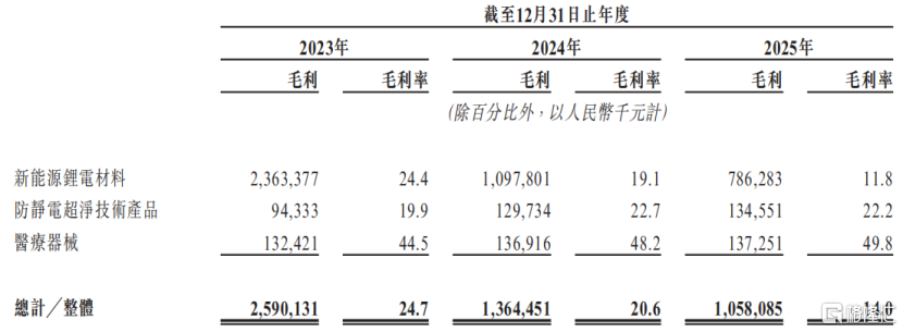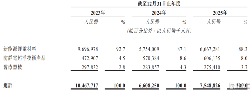 其中,新能源锂电材料(主要包括锂化合物产品)是公司的主要收入来源,2025年,该部分业务的收入占比为88.3%,防静电超净技术产品的收入占比为8%,医疗器械(主要包括注射器)业务的收入占比为3.7%。