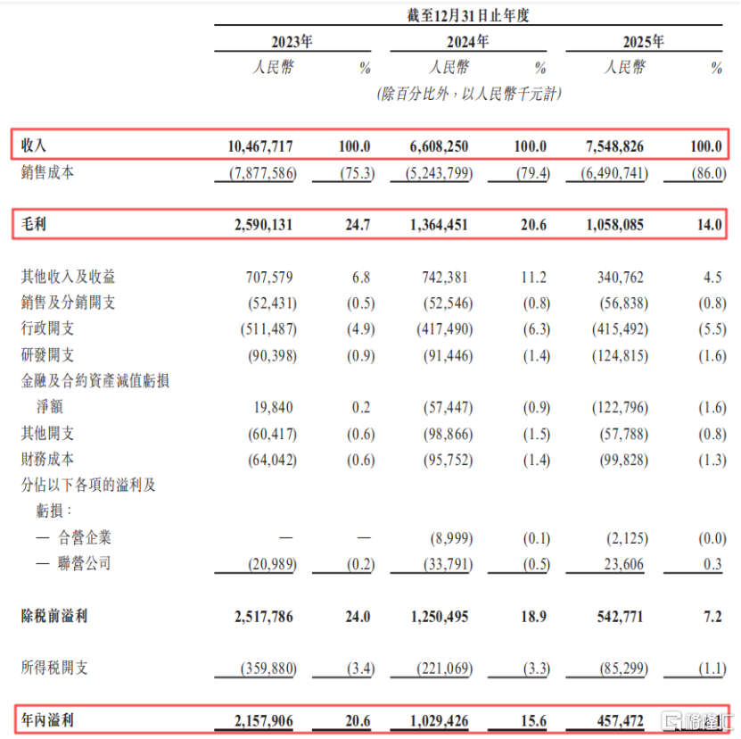 2023年、2024年及2025年(报告期),公司的收入分别为104.68亿元、66.08亿元、75.49亿元。