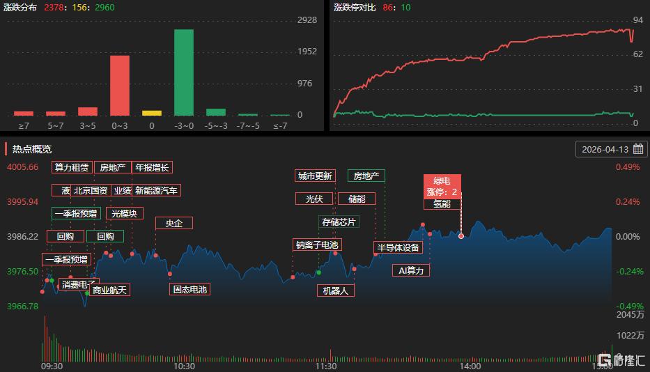 4月13日,A股三大指数集体上涨,全市场成交额2.16万亿元,超2900股下跌。盘面上,板块方面,玻纤制造、锂矿股、油气股走高,游戏、医药商业、中药股走弱。