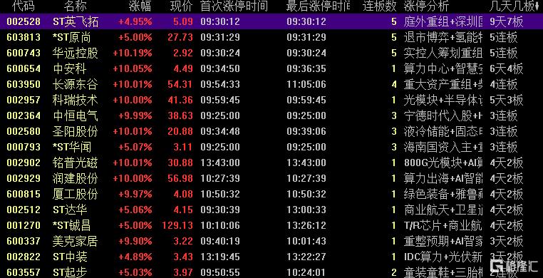焦点股方面,并购重组的华远控股5连板、长源东谷4连板,算力板块中安科6天4板。