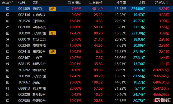 在龙虎榜中,涉及深股通专用席位的个股有15只,盛新锂能的深股通专用席位净买入额最大,净买入1.12亿元。
