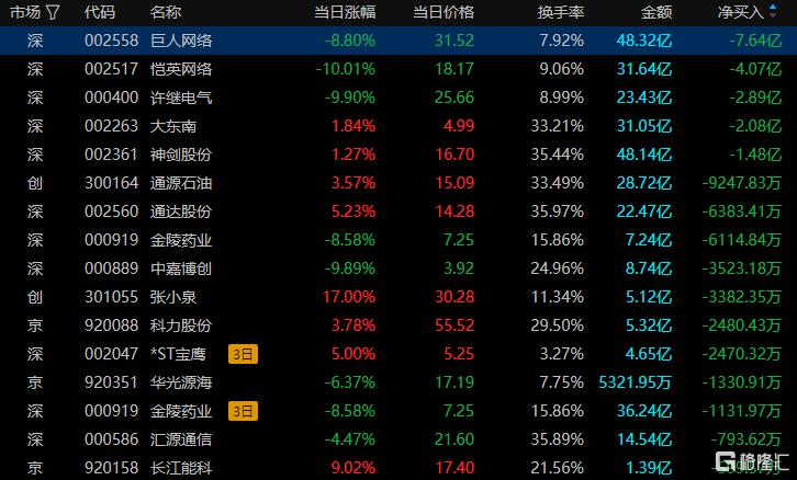 龙虎榜单日净卖出额前三为巨人网络、恺英网络、许继电气,分别为7.64亿元、4.07亿元、2.89亿元。