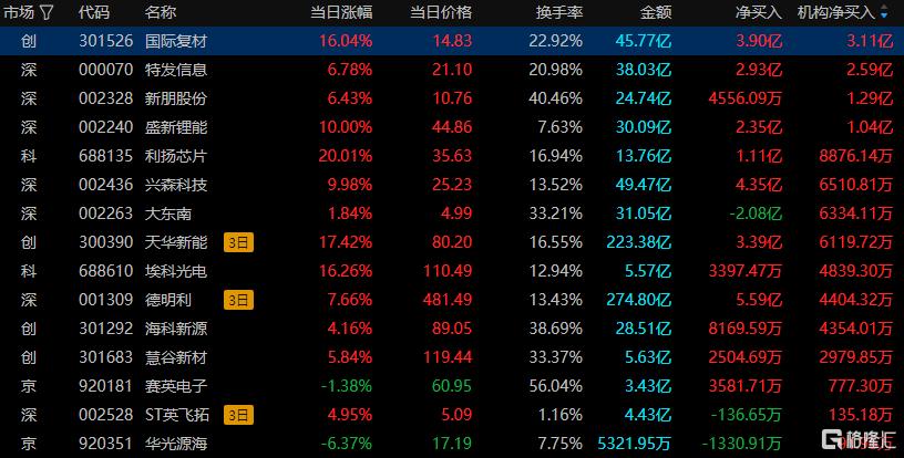 龙虎榜中涉及机构专用席位的个股中,当日净买入额前三为国际复材、特发信息、新朋股份,分别为3.11亿元、2.59亿元、1.29亿元。