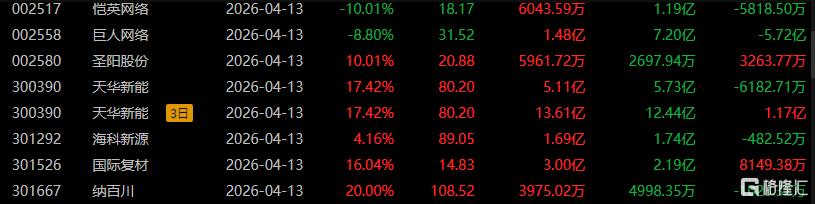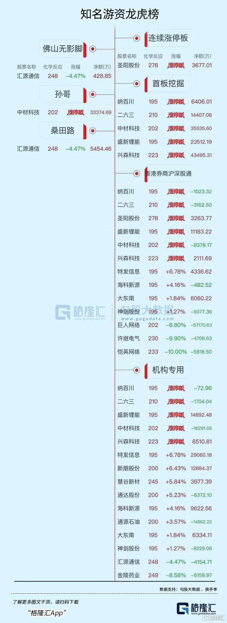 龙虎榜中涉及机构专用席位的个股中,当日净卖出额前三为恺英网络、巨人网络、中材科技,分别为3.39亿元、1.65亿元、1.63亿元。