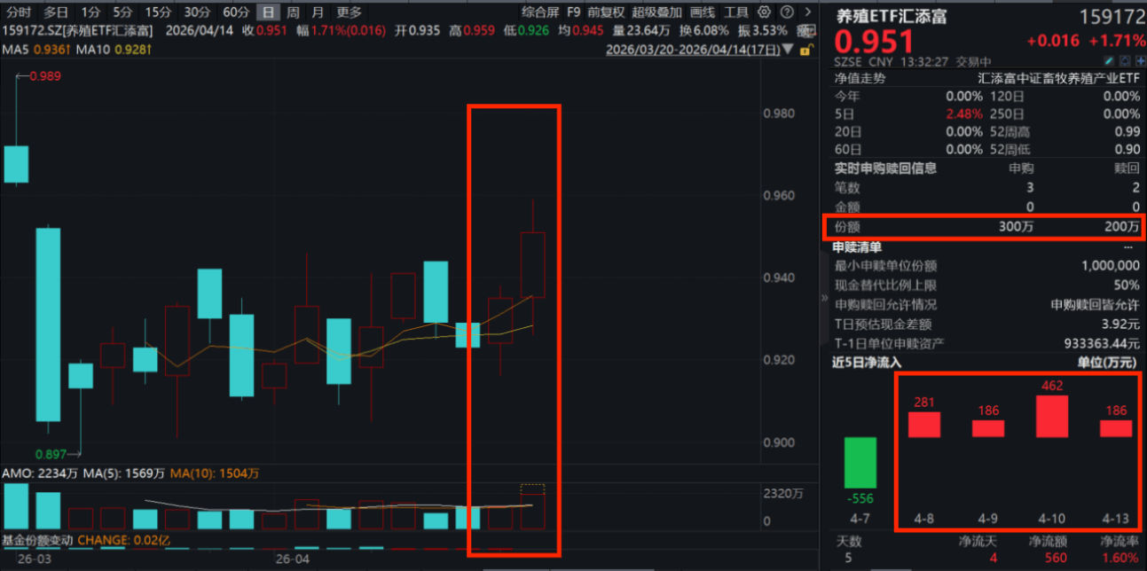 今日(4.14),受国际局势缓和影响A股飘红,养殖板块再度活跃!全市场“含猪量”更高更纯的养殖ETF汇添富(159172)涨近2%,成交额已超2200万元,规模、流动性持续领先同类!资金积极布局养殖板块,养殖ETF汇添富(159172)已连续第5日“吸金”,今日盘中获净申购100万份,此前4日累计净流入超1100万元!