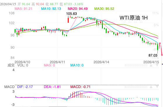 原油短线(1H)走势持续震荡向下创新低价格。均线系统空头排列,短线客观趋势方向向下。MACD指标在零轴下方低位张口向下,空头动能表现强劲。早盘油价触及87新低在主趋势下行节奏中运行,预计日内原油走势仍将下行继续创新低。