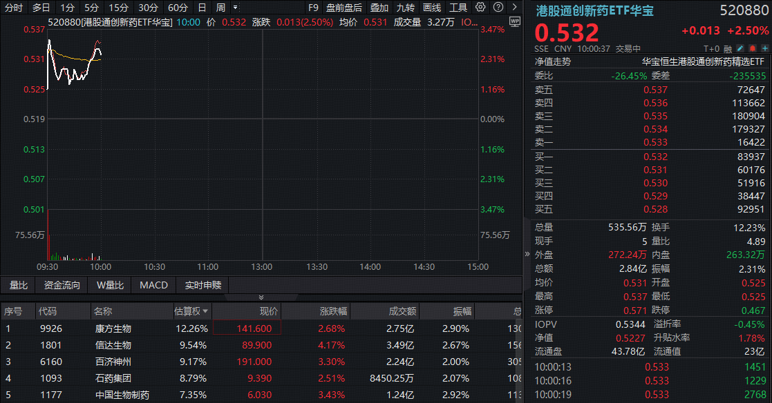 重磅政策利好来袭,4月15日早盘,港股医药强劲反弹! 100%创新药研发标的——港股通创新药ETF华宝(520880)一度冲上3%,现涨2.5%,权重龙头集体拉涨,信达生物涨超4%,百济神州、中国生物制药涨超3%。