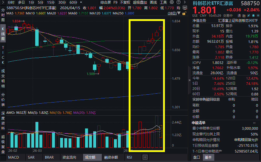 4月15日,A股市场震荡上行,沪指站稳4000点,截至10:45,科创芯片ETF汇添富(588750)涨超2%,冲击8连阳!