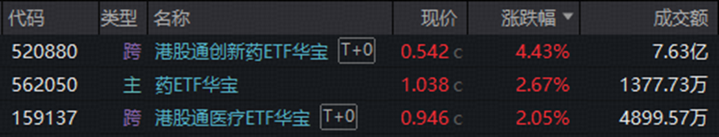 政策暖风劲吹,A港医药资产领市大涨,相关热门ETF集体走强!重仓A股创新药的药ETF(562050)收涨2.67%站上半年线。100%创新药研发标的——港股通创新药ETF华宝(520880)劲涨4.43%!港股医疗核心资产——港股通医疗ETF华宝(159137)收涨2.05%放量连阳。