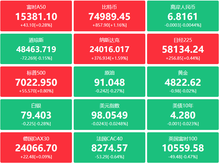 外盘:市场关注美伊谈判进展及中东局势,且美国总统特朗普暗示本周可能达成协议,美股收盘涨跌互现,其中道指跌72.27点,跌幅0.15%报48463.72点;纳指涨376.93点,涨幅1.59%报24016.02点,为连续11个交易日上涨并创收盘新高,11个交易日累计涨幅超15%;标普500指数涨55.57点,涨幅0.80%报7022.95点,创历史新高;科技股普涨,特斯拉涨超7%,微软、博通涨超4%,苹果涨近3%,英伟达、谷歌、Meta涨超1%。加密货币概念、AI软件应用、汽车制造涨幅居前,Figma、Robinhood涨超10%,Datadog涨超9%,Coinbase、路特斯涨超6%。黄金、美国基建股跌幅居前,科尔黛伦矿业跌超7%,金田跌超5%,卡特彼勒跌超3%。Allbirds大涨582%;利弗莫尔中概股龙头指数收涨0.67%,热门中概股多数上涨,知乎涨超4%,百度、网易涨超2%,阿里巴巴涨超1%,蔚来跌超2%,理想汽车跌超3%。