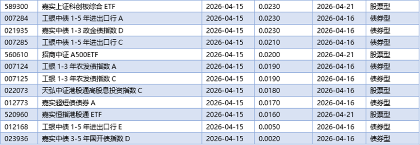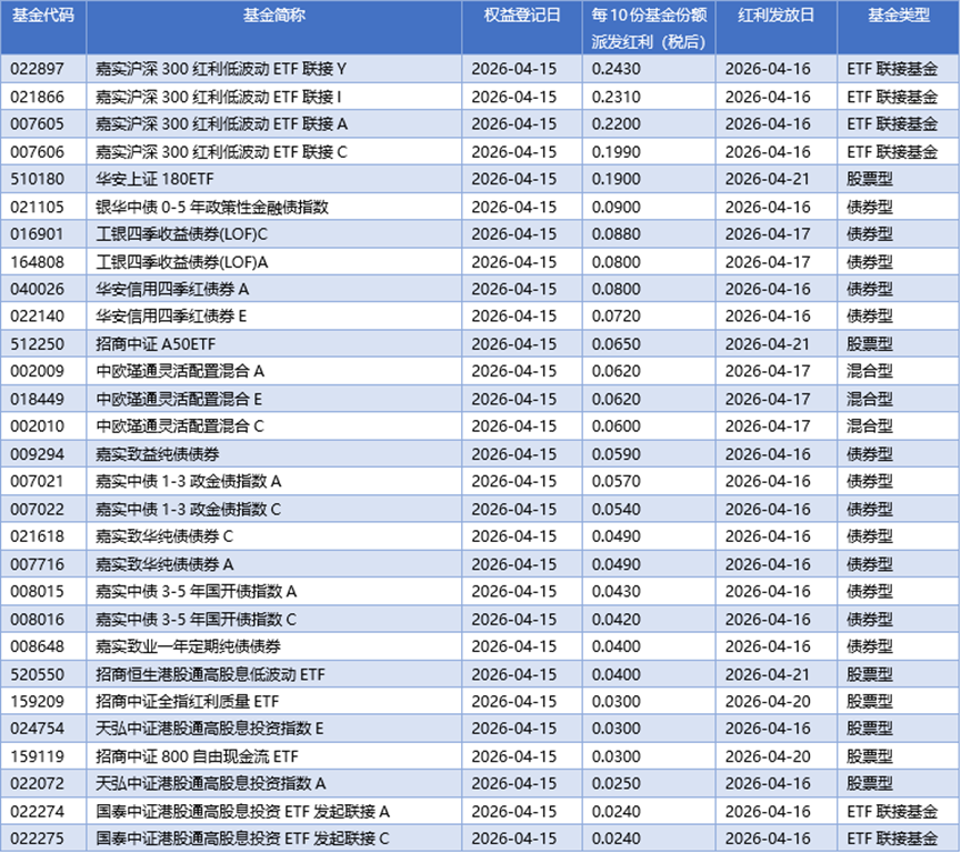 四、04月15日基金分红一览