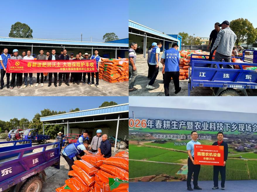 物资帮扶补短板,精准助力春耕忙。针对春耕农资、农机缺口,分公司精准发力,向惠州、源城当地农业经营主体捐赠优质肥料55吨,有效补充春耕农资供给,助力提升耕地肥力;同时,向源城区埔前镇捐赠新型农机设备,切实补齐春耕生产装备短板,构建起“风险保障+物资支持”的双轨助农机制,为春耕生产注入动力。