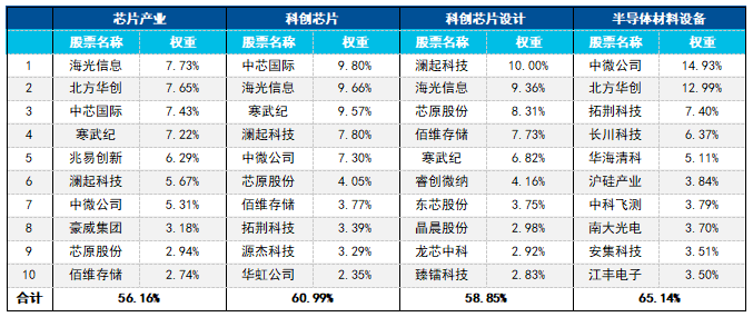 第三,重仓股结构不同。半导体材料设备指数前十大成份股合计占比超65%,集中度最高,且以中微公司、北方华创、拓荆科技等设备龙头为主。科创芯片设计指数则由澜起科技、海光信息、芯原股份等数字芯片设计公司主导,是AI芯片含量最高的指数之一。芯片产业指数覆盖全产业链龙头,个股权重分布也更加均衡,海光信息、北方华创、中芯国际等占比较高。科创芯片指数中,中芯国际、海光信息、寒武纪等科创板半导体龙头权重突出,兼顾设备与设计环节。