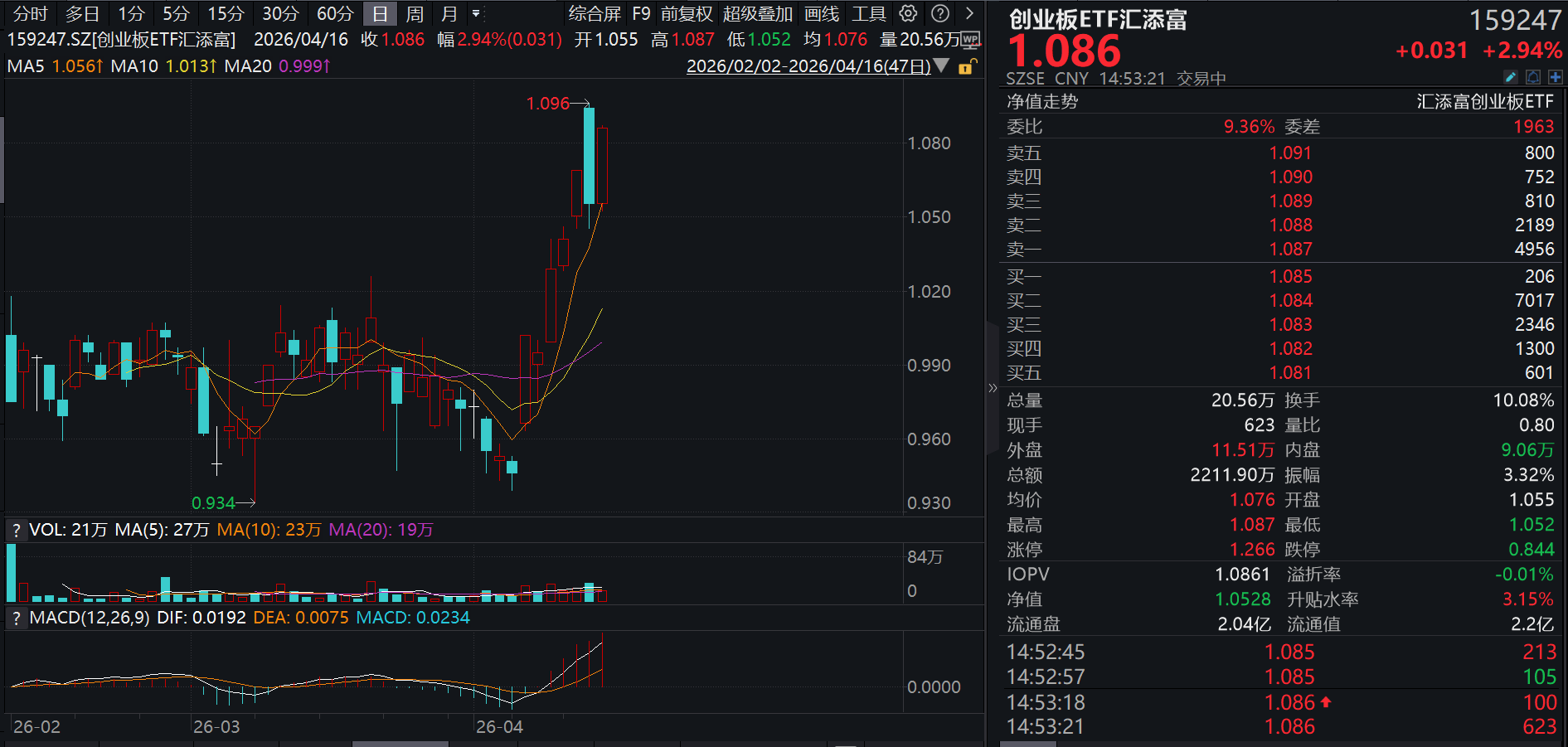今日(4.16),创业板指拉升涨逾3%再创11年新高!创业板ETF汇添富(159247)大涨3%,成交额超2200万元。
