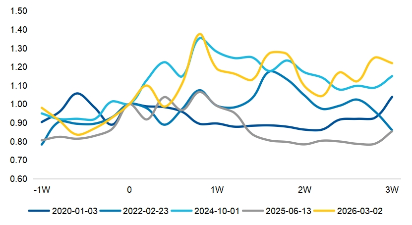 数据来源:Wind,易方达测算。选取地缘冲突(2022)、中东冲突升级(2020、2024、2025、2026)等典型地缘风险事件,以事件发生日为基准,对前后区间内的VIX走势进行归一化处理,以便比较不同事件下风险情绪的变化路径。