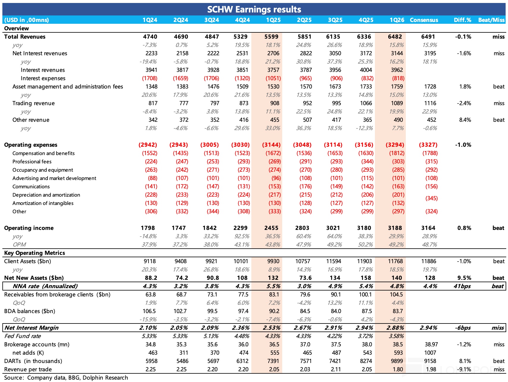 $嘉信理财(SCHW.US) 一季度业绩其实本身还可以,但市场预期相对饱满,可能会介意收入略微 miss 的表现,以及息差收益率(NIM)环比下降的瑕疵。