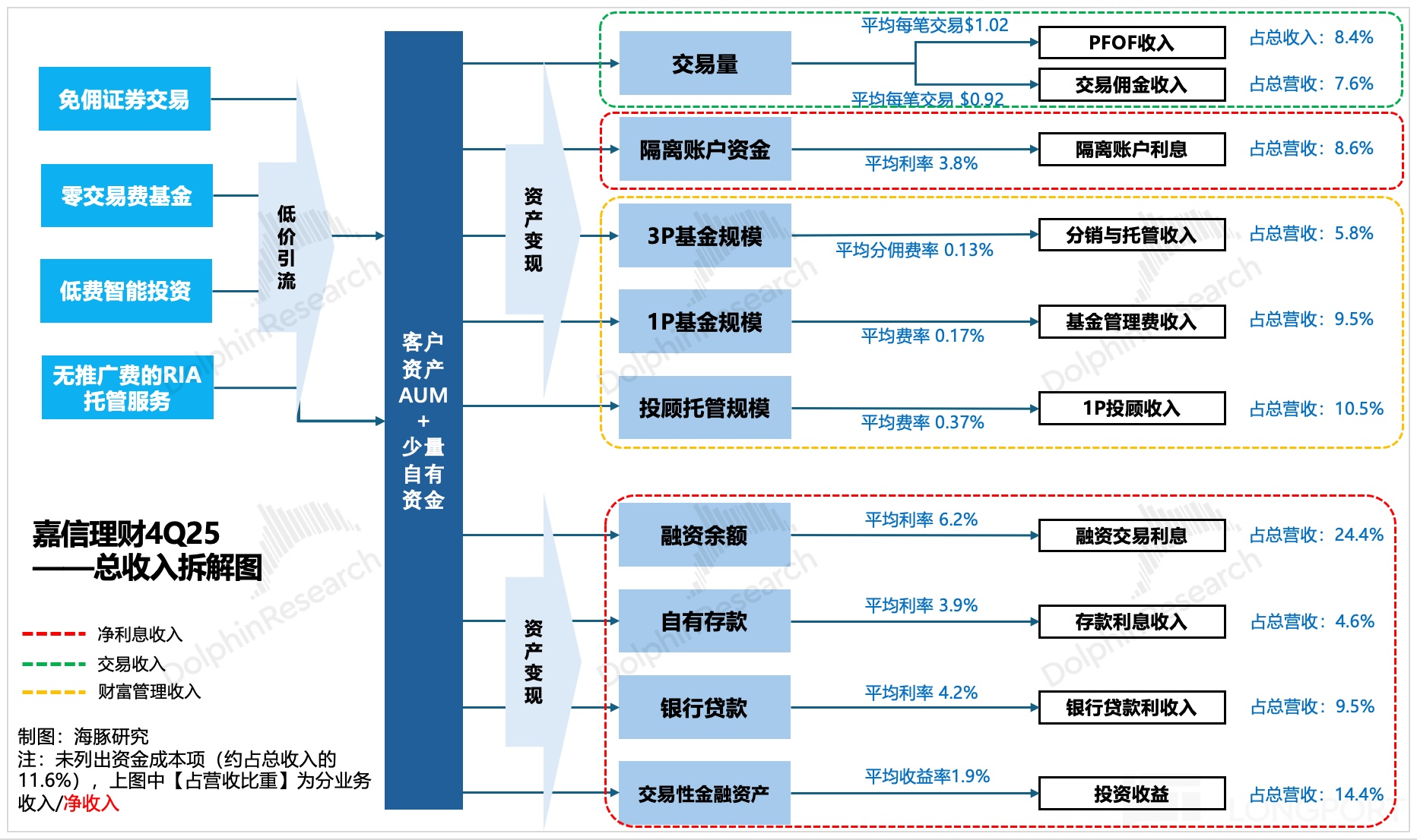 在交易、基金降佣的大趋势下,嘉信依靠存贷息差、投资固收类的金融资产带来的利息收益,弥补了交易收入的缺口。从集团整体来看,商业模式逐步定型——通过免佣金的证券交易,低通道费、零交易费的基金申赎,低咨询费的智能投资以及无推广费的独立 RIA 托管服务来引流,壮大整体客户资产规模(AUM)后,最终以资产生息(存、贷款利息/投资收益)为主的创收模式。