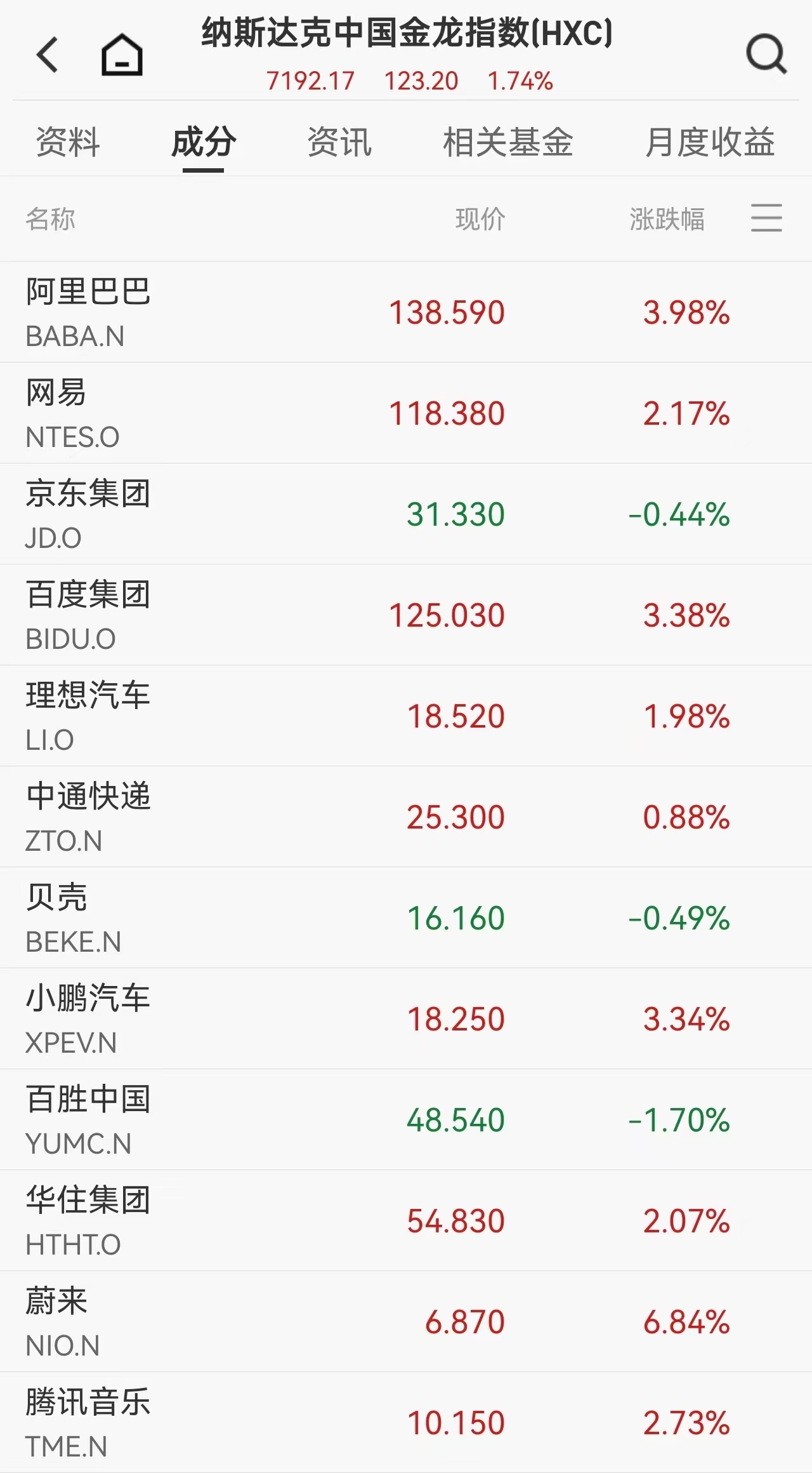 中国资产在隔夜市场迎来集体爆发,纳斯达克中国金龙指数收涨1.74%,连续第五个交易日走强。龙头股方面,阿里巴巴、百度涨超 3%,网易涨 2.17%,拼多多涨1.71%;新能源汽车股中,蔚来大涨超 6%,理想汽车涨近2%;教育股同样表现亮眼,新东方、好未来涨超 5%,仅京东等少数个股小幅收跌。