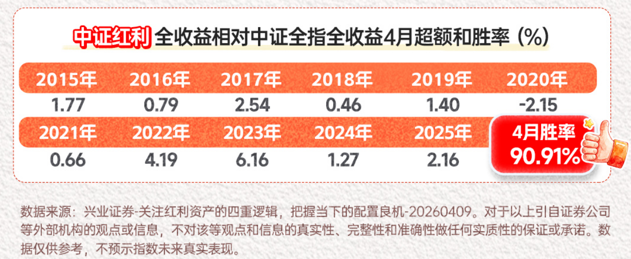 第一,四月日历效应显示红利占优。历史数据显示,中证红利全收益指数在4月的超额胜率高达91%,年报季业绩确定性和高分红方案落地,使红利风格天然占优。即便成长股反弹,资金也不会完全放弃这一相对“确定性窗口”。