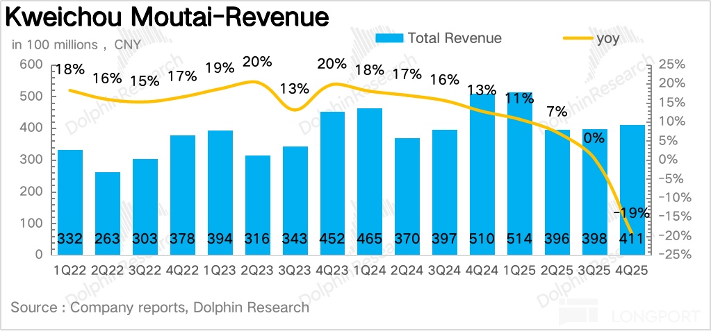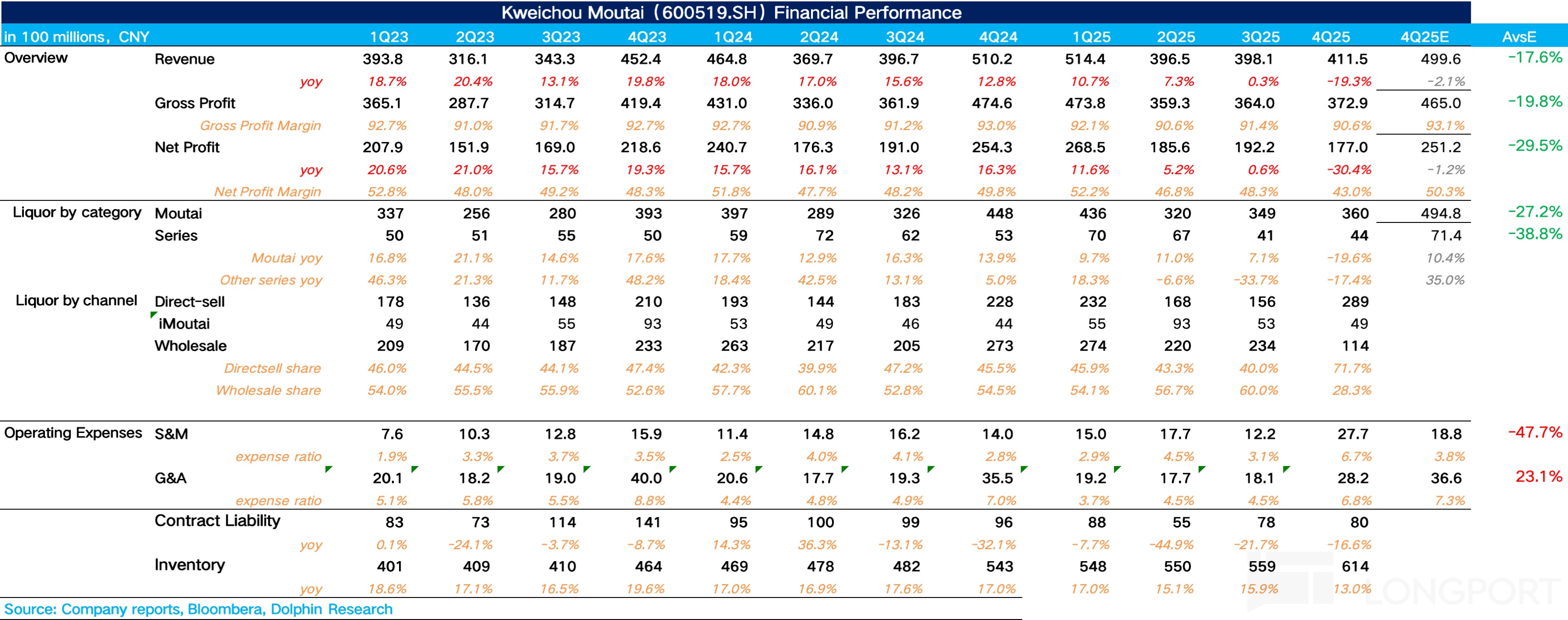 对于 Q4 的业绩,海豚君此前分析过,为了释放渠道压力,茅台在 Q3 就开始主动降速,Q4 进一步放慢发货节奏,12 月更是直接宣布非标减量 30%-50%、停止珍品供应,并下调精品茅台和 1935 的出厂价。一系列"自我革命"式的调整,再加上茅台也没有像往年在 12 月-1 月期间披露业绩预告,基本可以推断出茅台四季度的业绩不会好。只不过最终业绩的下滑幅度确实也超出了海豚君的预期,但其实也侧面反映出茅台愿意主动刺破泡沫、打破 “报表崇拜”,坚定市场化改革的决心(下文详细分析)