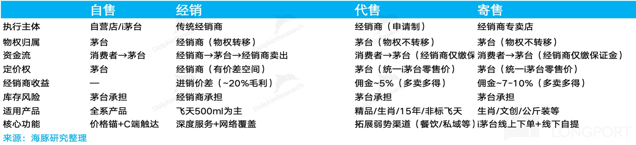 除了 i 茅台外,另一个重大改革在于茅台将运营模式从"自售 + 经销"升级为 "自售 + 经销 + 代售 + 寄售" 四位一体,为了方便大家理解,海豚君在下表整理了四种模式的区别。