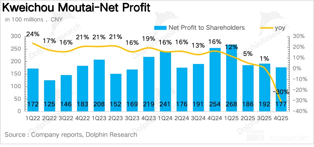从全年维度看,2025 年茅台实现营收约 1720 亿元,同比下降 1.4%,归母净利润 823 亿元,同比下滑 4.5%,这也是茅台上市以来首次收入&利润端双双下滑。
