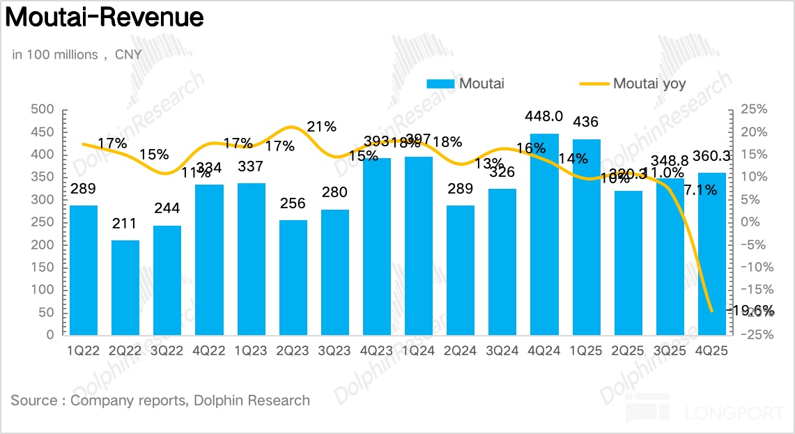 4Q25 茅台酒实现营收 360 亿元,同比下降 20%,全年维度下降 10%。
