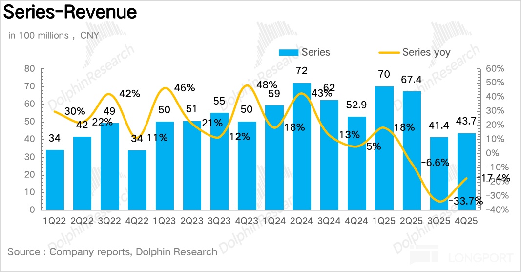 3、系列酒:1935“阵痛期” 接近尾声。系列酒实现营收 44 亿元,同比下降 17.4%,较 Q3 降幅有所收窄。虽然王子/迎宾等大众带价盘倒挂与库存出清未完全结束,但系列酒经过前期持续去库、渠道基本回归健康水位,叠加终端动销环比改善,海豚君推测四季度表现较三季度显著修复,成为系列酒端最主要的支撑力量。2026 年随着 1935 重新定价、渠道库存出清,系列酒有望回归正增长轨道。