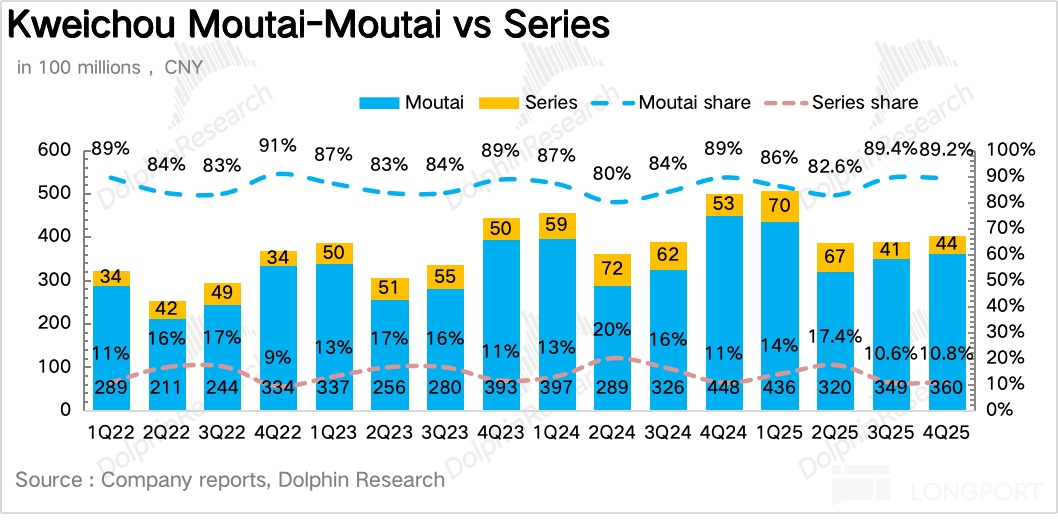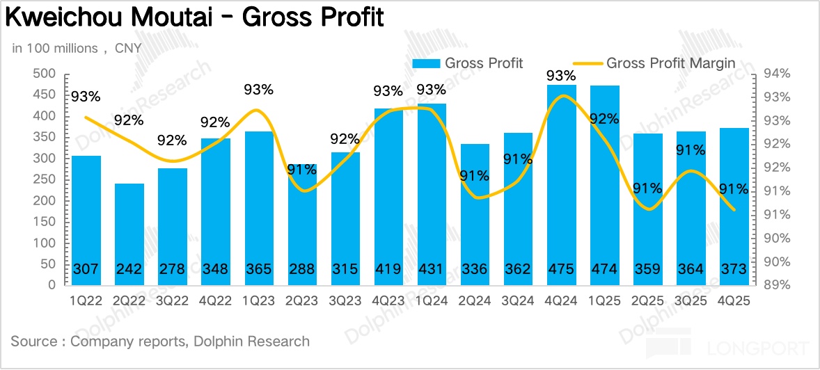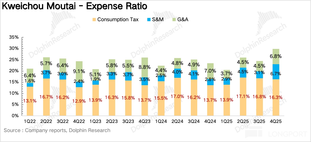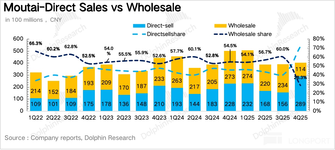 4、直营占比大幅拉升。从渠道结构来看,4Q25 茅台直营渠道实现营收 289 亿元,同比增长 27%,占比阶段性拉高到 72%。在 i 茅台几乎不贡献收入的情况下(i 茅台内部改革)海豚君推测茅台把部分原本流向批发渠道的配额投向了企业团购、线下自营体验店等直营渠道。
