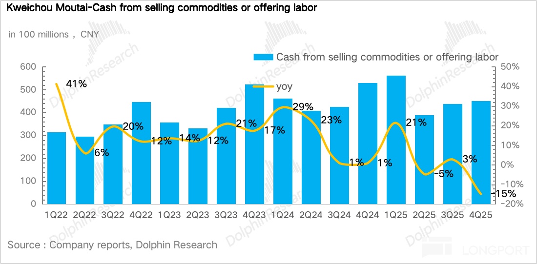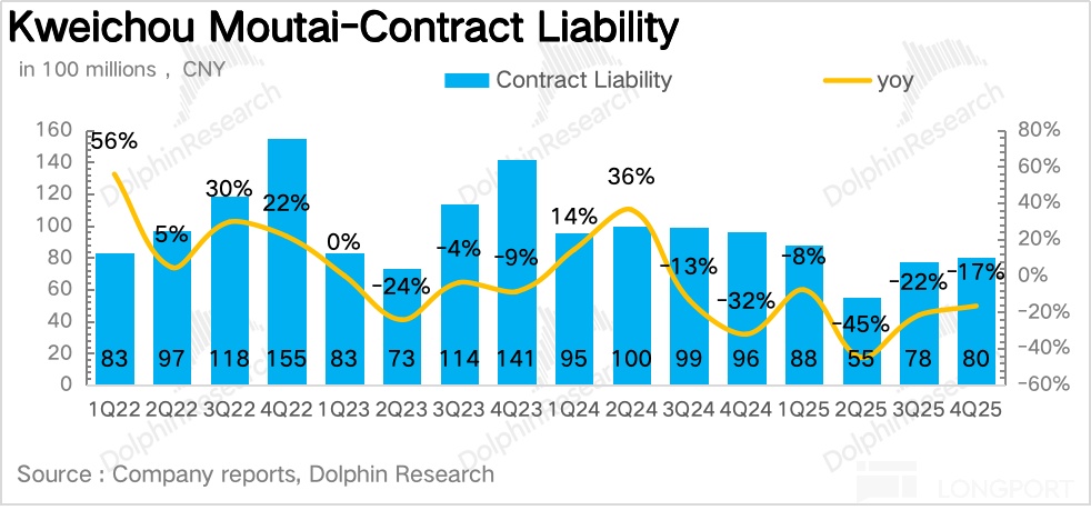 过去数年,茅台一般都是通过向经销商压货、提前确认收入来"调节"报表节奏。但 2025 年公司主动放慢了发货节奏,尤其是 Q3(+0.3%)和 Q4(约-0.6%),报表端的数据几乎等同于实际终端动销。这也意味着 2025 年的业绩基数是"干净"的,不存在透支未来的问题。