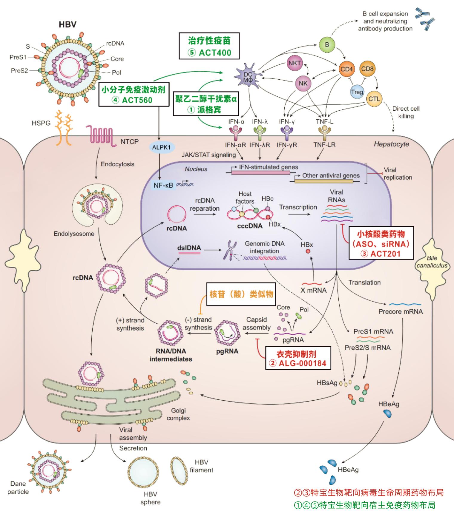 ①ACT560系靶向α激酶1(ALPK1)靶点的全新免疫激动剂药物,通过激活ALPK1激酶和下游信号通路,诱导趋化因子和细胞因子基因的转录,从而调节先天免疫反应,这为改善部分慢性乙肝患者对干扰素治疗应答不足的状况提供了潜在策略;研究表明,该药物能够迅速降低血清HBV DNA、HBsAg水平,ACT560与干扰素等其他抗病毒药物联用后,能进一步降低HBV DNA。