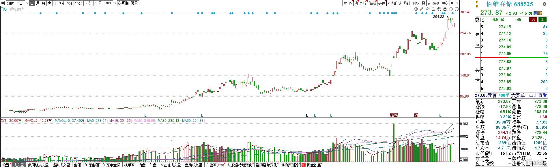 股价表现方面,截至午间收盘,佰维存储跌4.51%报273.87元/股,总市值为1289亿元,今年以来股价大涨138.58%。