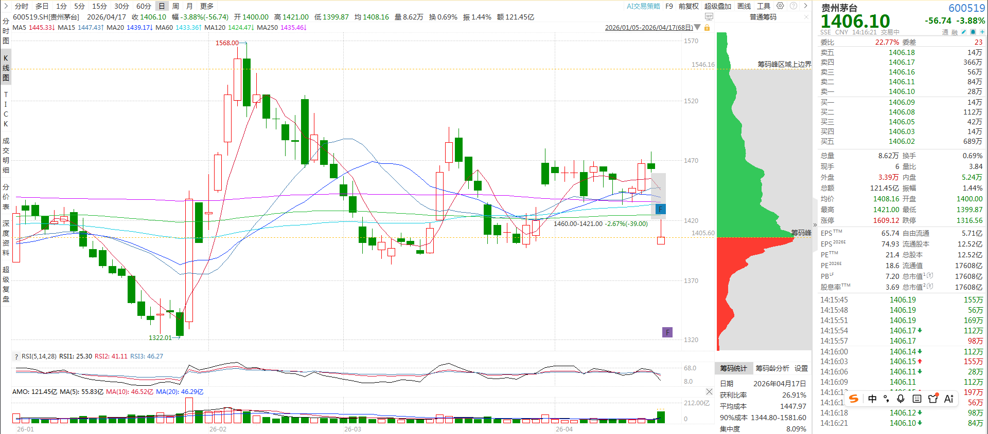 与源杰科技的强势形成鲜明反差的,是昔日A股“股王”贵州茅台的疲软承压。长期以来,贵州茅台作为A股市场公认的核心大白马股、高股息标的,是机构资金配置的核心选择,更是价值投资的标杆性存在——稳定的营收、充沛的现金流、持续的分红能力,使其常年占据A股高价股榜首,深受保险、社保等稳健型资金的长期追捧,成为A股市场“防御+增值”的核心资产。但4月17日,贵州茅台大幅低开4.3%,开盘价定格在1400元,单日市值蒸发接近800亿元,颓势明显。背后直接诱因是16日晚间披露的2025年年报:全年实现营业收入1688.38亿元,同比下滑1.21%;归母净利润823.2亿元,同比下降4.53%,这也是公司2001年上市以来首次出现营收与净利润同步下滑,其中四季度营收同比下滑超19%、净利润同比降幅超30%,茅台酒与系列酒营收双双承压,进一步加剧股价回调。这场“新旧股王”的交替,或正是A股市场风格的悄然切换——曾经被资金奉为圭臬的传统大白马、高股息板块,逐步让位于高成长、高景气、高壁垒的高科技赛道。源杰科技,正是这一风格切换最直观、最有力的印证。