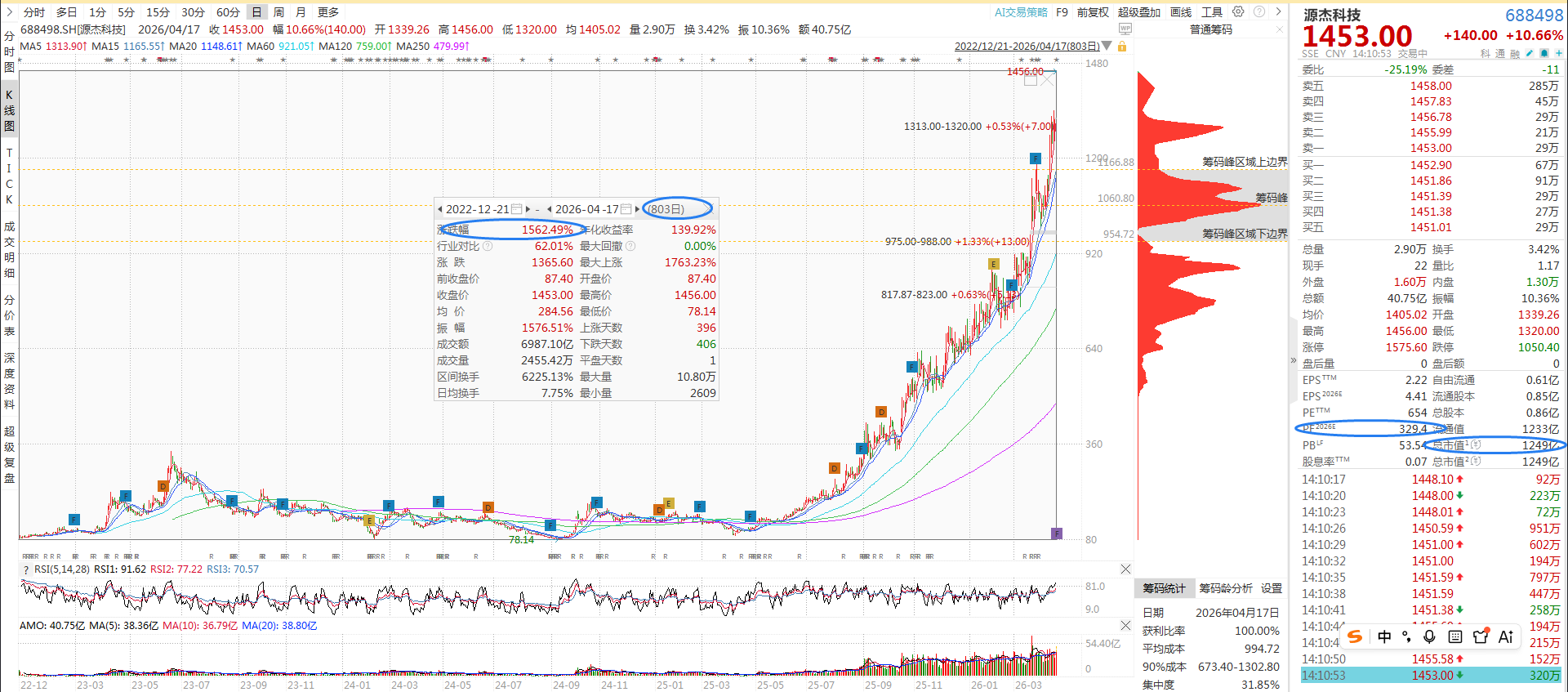 值得深思的是,源杰科技的估值水平与业绩增长虽形成鲜明呼应,但暗藏值得反思的市场信号。截至4月17日14时许,公司总市值已达1244.34亿元,而其2025年全年营业收入仅为6.01亿元,营收与市值的差距高达207倍;对应1.91亿元的归母净利润,最新市盈率(TTM)升至651.75倍,远超光芯片及相关领域同类企业——海光信息市盈率(TTM)约118.82倍、长光华芯市销率约16.84倍。源杰科技的高估值,固然源于其业绩的爆发式增长、IDM全流程技术壁垒,以及AI算力驱动下高速光芯片的稀缺性溢价,但6亿营收撑起超1200亿市值的背后,或许正是市场向投资者释放的新风格信号。
