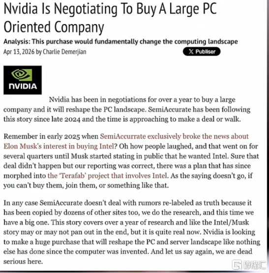 惊动英伟达的是一篇头天出现的媒体报道,内容称英伟达已就收购一家大型PC公司进行了一年多的谈判,如今达成交易或放弃收购的时机已临近。消息显示,英伟达正计划展开一笔巨额收购,这将彻底重塑个人电脑和服务器的格局,其影响之大,自计算机发明以来前所未有。