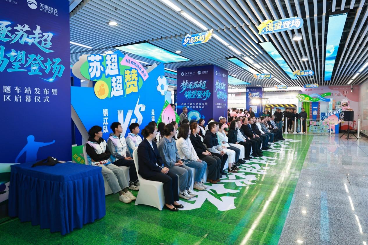 一趟“苏超”主题列车正驶入站台,车厢以江苏银行品牌蓝为底,搭配球场绿与樱花粉,“苏银相伴 超有锡望”的标语从车窗上掠过,有球迷穿着无锡队球衣专门来打卡,笑着说:“还没到赛场,感觉主队气氛已经拉满了。”
