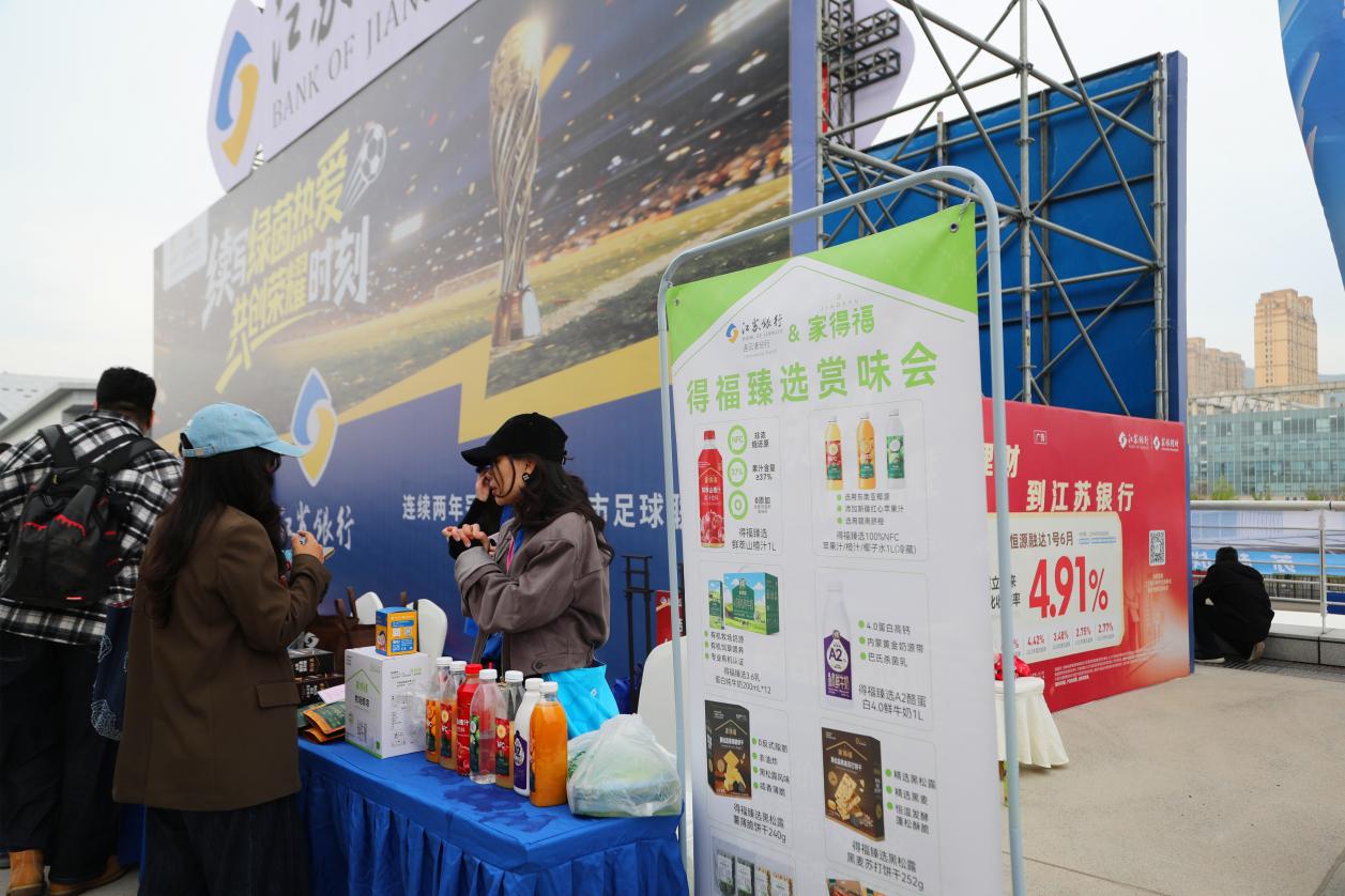 同一时间,连云港体育馆中心主入口内场,江苏银行连云港分行的8个特色金融服务专区已经布置妥当。这边常州球迷在雨中踢趣味射门,那边连云港球迷正端着一次性小杯品尝家得福超市的明星产品。分行联手这家本土零售连锁,把地道港城风味搬进了赛场,有球迷边嚼着零食边跟同伴感慨:“排队入场还能顺带尝鲜,这体验感很新奇。”