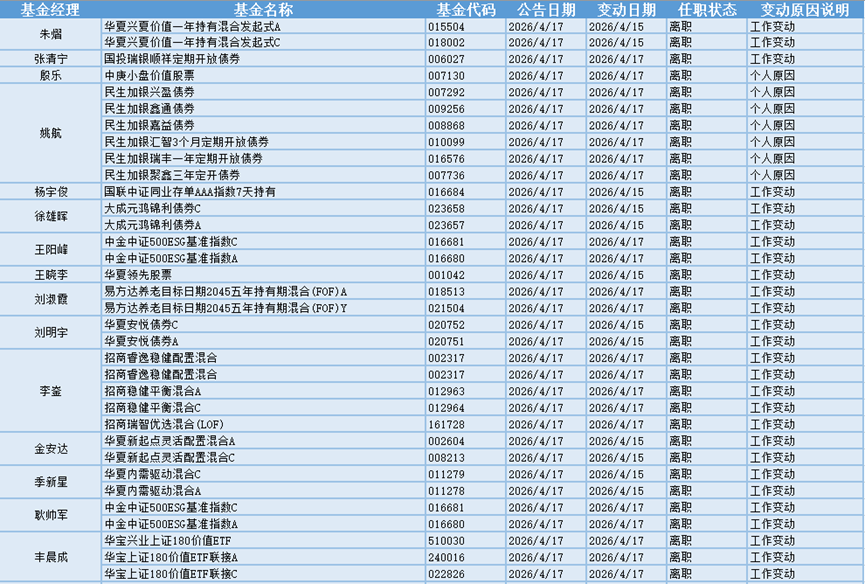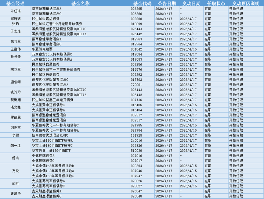 基金经理是一只基金产品最核心的成员,能决定一只基金的投资方向、投资策略以及投资风格,基金经理出色的择时选股能力和调研预测能力是基金业绩的有力保证,所以基金经理是投资者在选择基金产品时的重要依据。基金经理的变动很大程度上会影响到基金产品未来的表现,是一个需要特别关注的信息。4.17日共有34位基金经理发生任职变动。