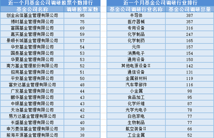 近一个月(3月18日-4月17日),创金合信基金参与公司调研的数量最多,共调研95家上市公司,此外调研较为活跃的还有博时基金、富国基金和嘉实基金,分别调研75家、69家、59家上市公司;从调研行业上来看,基金公司对半导体行业的上市公司调研次数最多,共有387次,其次是医疗器械行业,基金公司调研了357次。