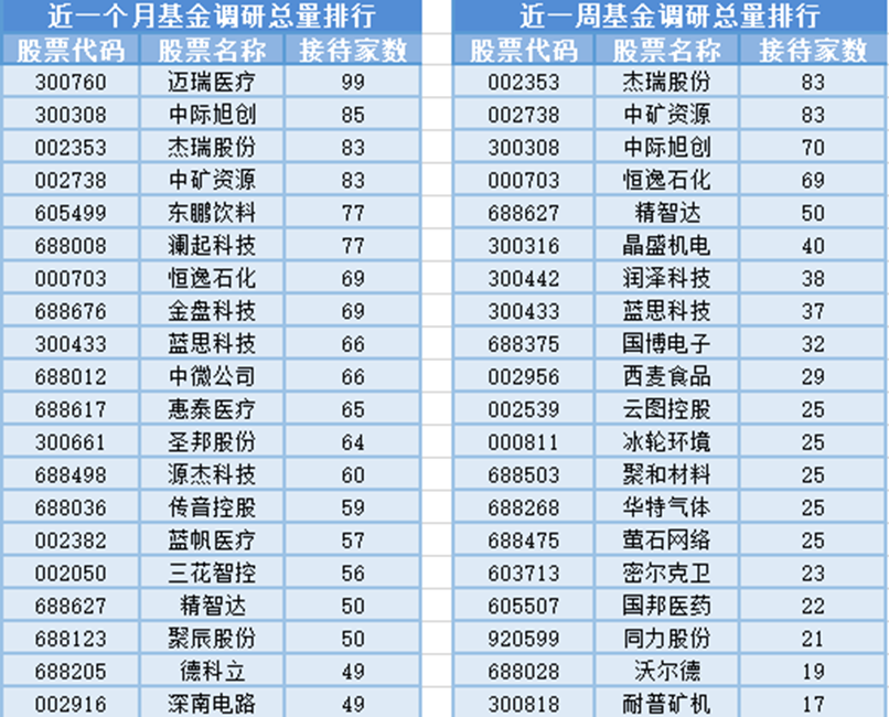 从个股调研情况上来看,最近1个月(3月18日-4月17日)最受公募基金关注的是迈瑞医疗,迈瑞医疗属于医疗设备行业,主营业务为医疗器械的研发、制造、营销及服务。共有99家基金管理公司参与调研,其次是中矿资源和东鹏饮料,分别接受83家、77家基金管理公司的调研。
